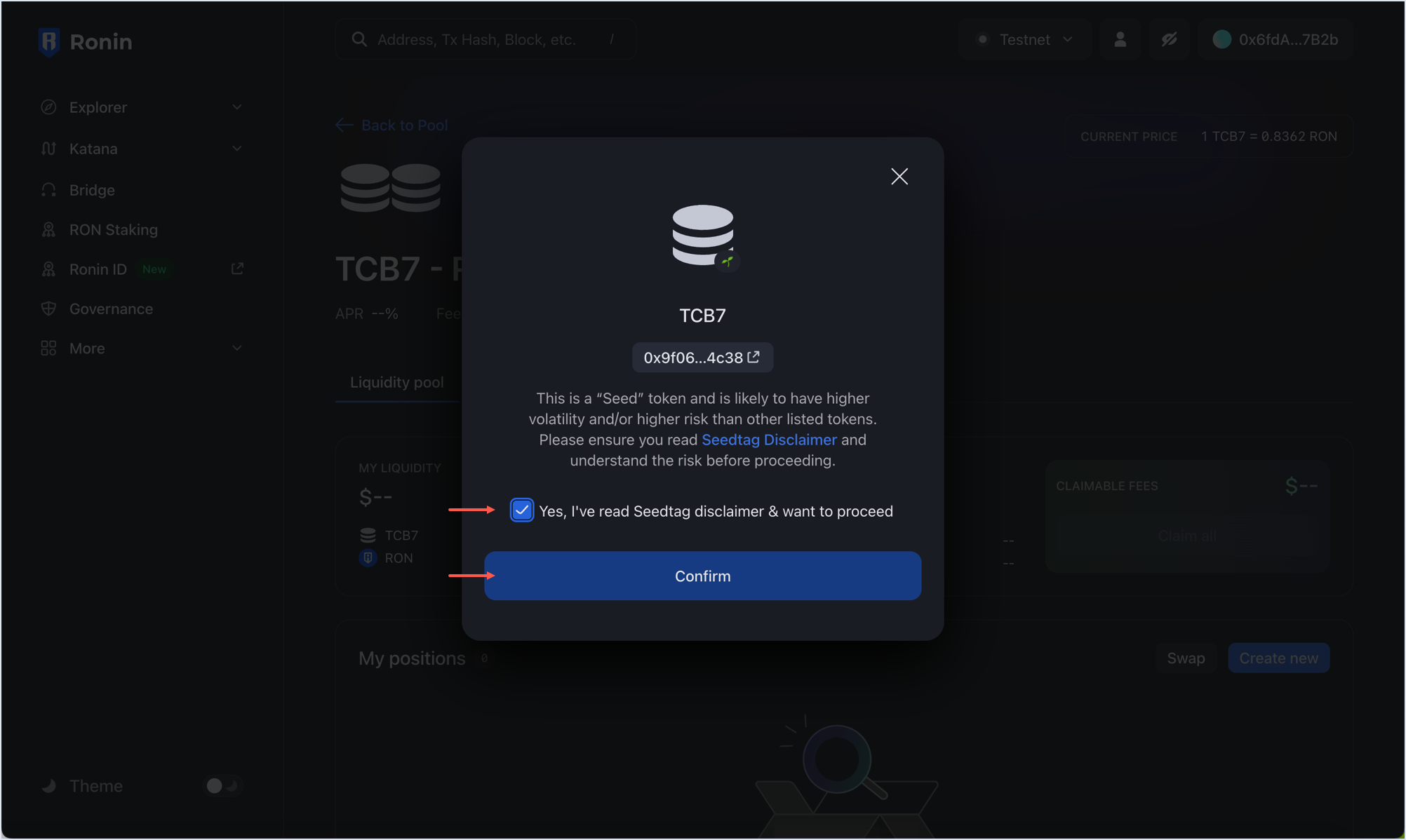 When you first interact with a token, Katana prompts you to acknowledge the risks involved, we encourage you to assess your risk tolerance before participating.