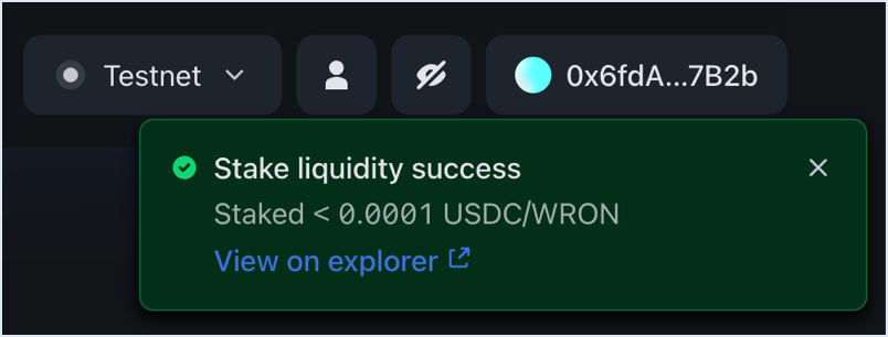Confirm the transaction in your Ronin Wallet. When the transaction completes, Katana displays a confirmation pop-up.