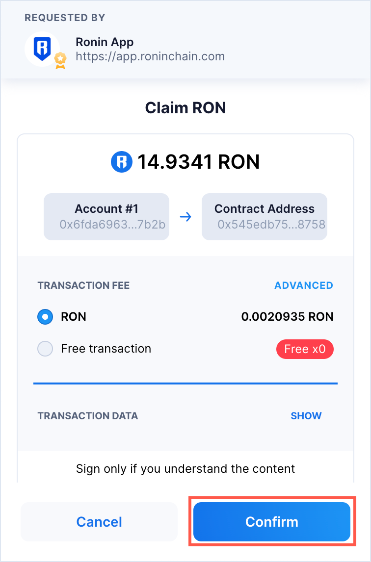 After the transaction is confirmed, you successfully restaked your RON rewards.