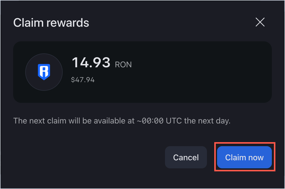 Instead of claiming the RON staking rewards to your Ronin Wallet, you can restake them to your favorite validator, which will increase your staking power.