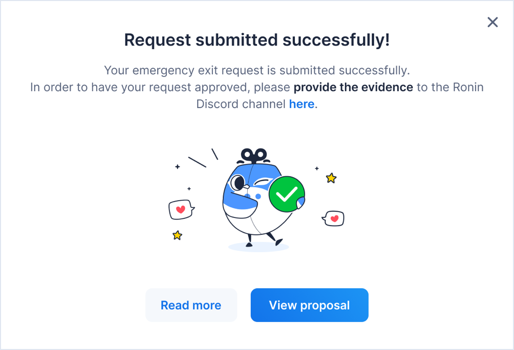 After the emergency exit is complete, you'll no longer be able to confirm blocks on Ronin and receive rewards. Your status will be set to "Renounced."