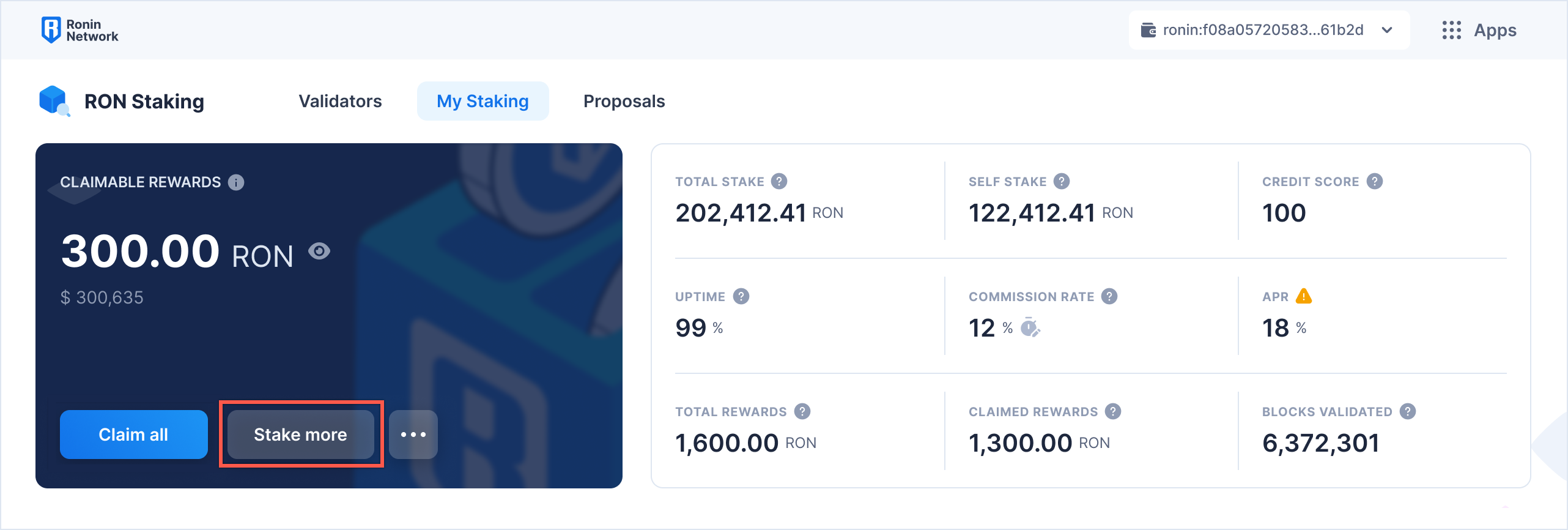 1. Open the Validator Dashboard, then select My Staking, and then click Stake more.