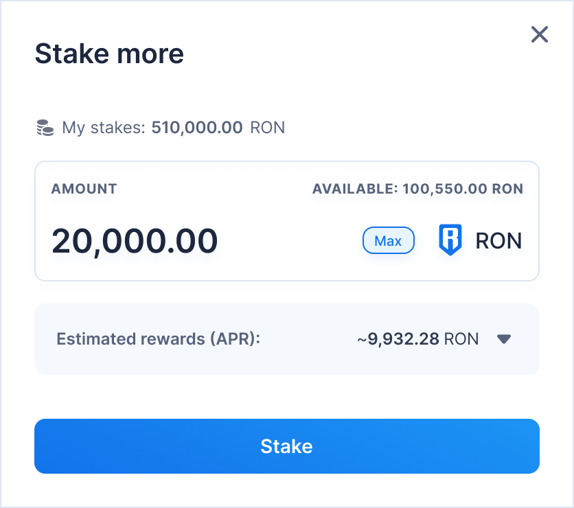 2. Enter the amount manually or choose Max to stake all available RON, and then select Stake. The estimated reward is calculated based on your estimated APR (annual percentage rate), so you can see how much RON returns from this stake.