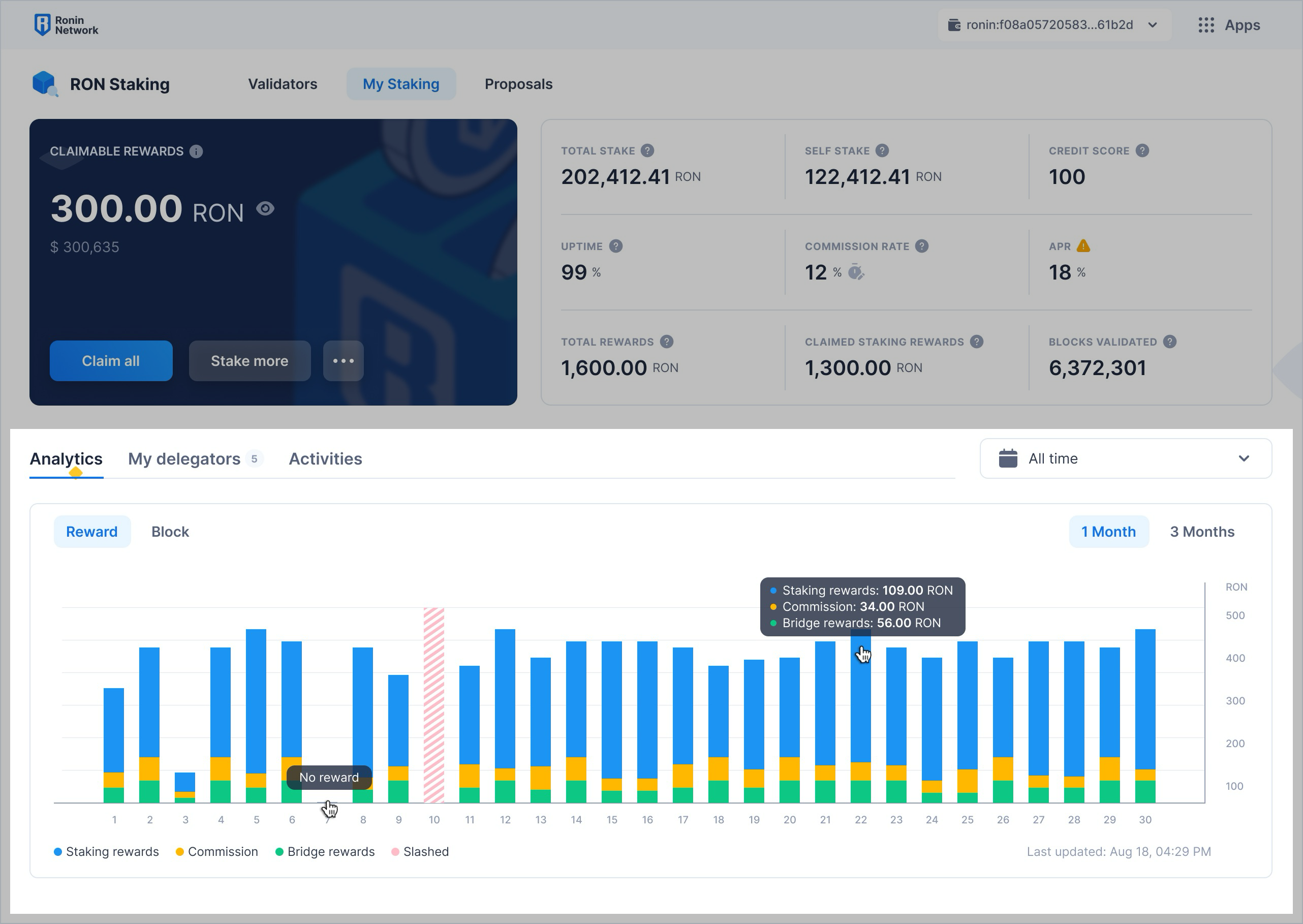 To view analytics about the rewards you earned and the blocks you produced over different periods, open the Validator Dashboard, then select My Staking, then open the Analytics tab.